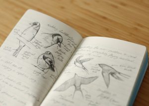 Keeping a field diary was a completely new concept to me, which I’ve now become really quite attached to. As a keen walker and photographer, I was used to taking quick snaps on the move but the course has taught me to slow right down and really look at my surroundings. Sketching wildlife seemed a challenge to pick up at first, particularly when you only catch a fleeting glimpse of a bird in flight, but it’s amazing what a bit of practice (and memory) can do. Admittedly, the camera does still join me on my outings!
